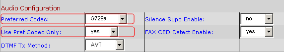 Change the “Preferred Codec” to G729a. Also change the “Use Pref Codec Only” to Yes. You can do this for both Line 1 and PSTN (i.e. if you are going to use PSTN).